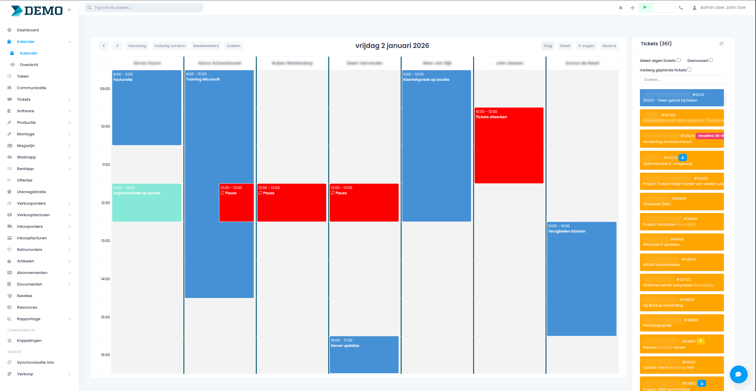Toelichting afbeelding: Hierboven zie je een voorbeeld waarbij je tickets eenvoudig in de agenda kunt slepen. Daarnaast is het mogelijk om tickets te zoeken of te filteren.